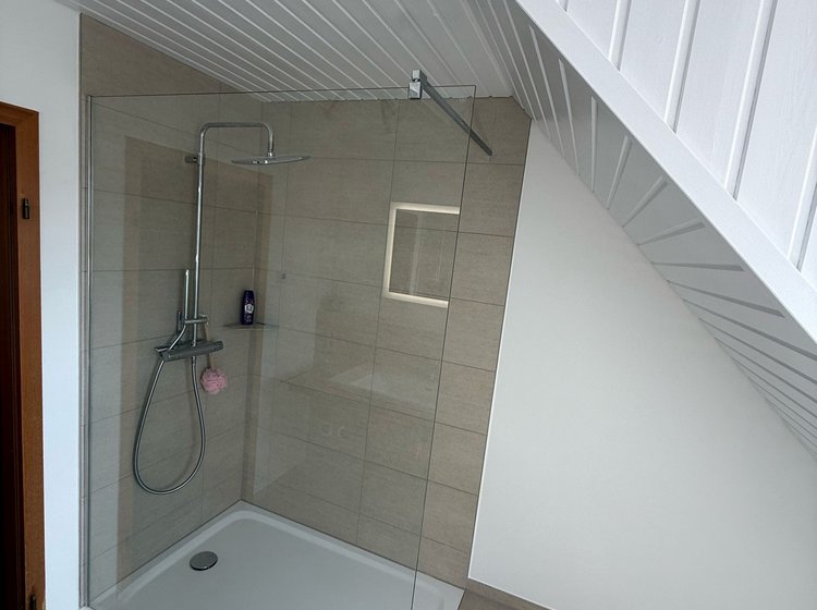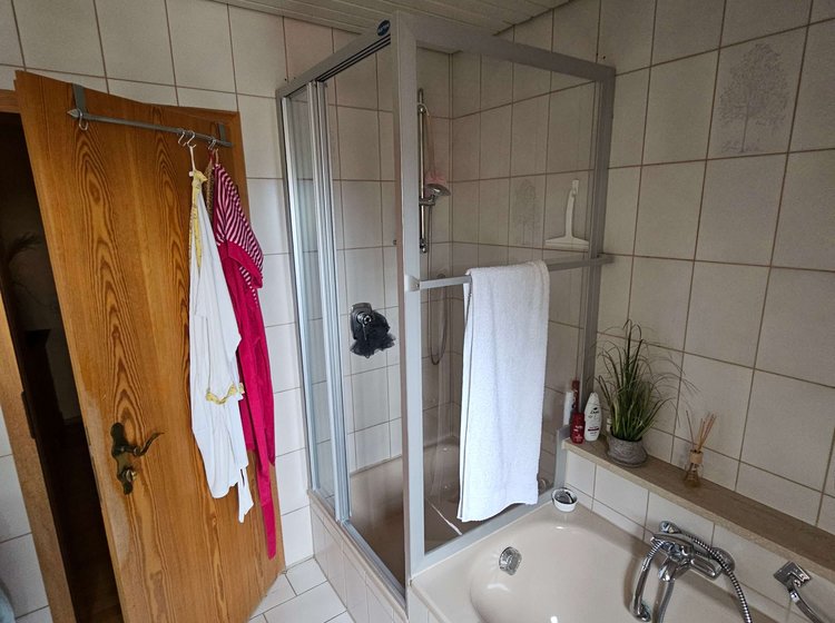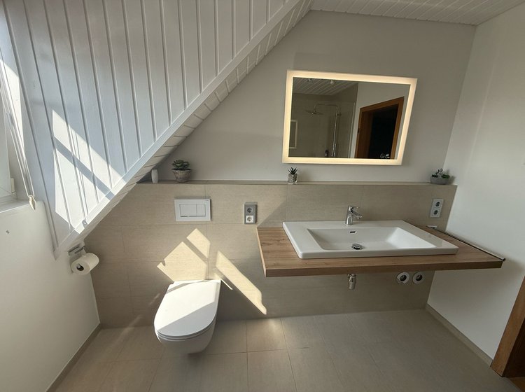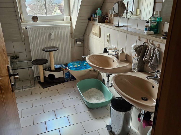 Bei diesem Modernisierungsprojekt im Dachgeschoss eines Wohnhauses in Wangen im Allgäu haben wir ein in die Jahre gekommenes Bad grundlegend neu gestaltet. Die "Vorher"-Bilder zeigen die typischen Probleme: beige Fliesen, ein beengtes Raumgefühl durch rustikale Einbauten und zwei getrennte, massive Waschbecken.